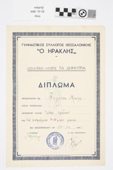 Το δίπλωμα απονεμήθηκε από το Γυμναστικό Σύλλογο Θεσσαλονίκης "Ο ΗΡΑΚΛΗΣ" στην αθλήτρια Γαλούπη Μαρία για την κατάκτηση της 3ης θέσης στο ομαδικό αγώνισμα της σκυταλοδρομίας γυναικών 4x80μ. , κατά την Αθλητική μέρα "ΤΑ ΔΗΜΗΤΡΙΑ" το 1948