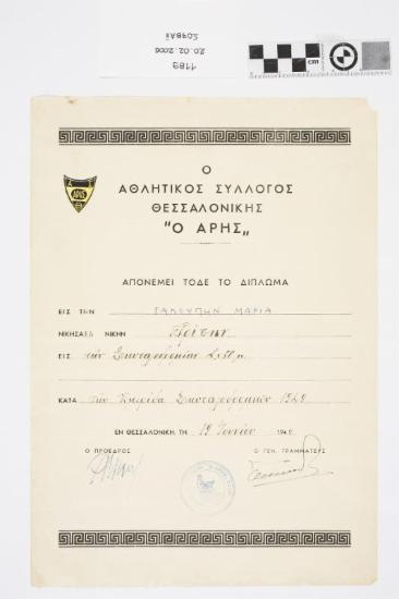 Το δίπλωμα απονεμήθηκε από τον Αθλητικό Σύλλογο Θεσσαλονίκης "Ο ΑΡΗΣ" στη Γαλούπη Μαρία για την κατάκτηση της 3ης θέσης στην σκυταλοδρομία 4x80 μ., κατά την ημερίδα σκυταλοδρομίας το 1949