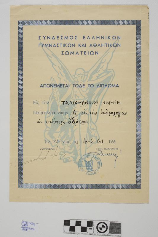 Δίπλωμα που απονεμήθηκε από το Σύνδεσμο Ελληνικών Γυμναστικών και Αθλητικών Σωματείων στην αθλήτρια Ταλιχμανίδου Ισμήνη