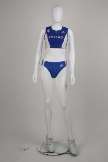 Φανελάκι, αμάνικο κοντό, λευκού και μπλε χρώματος, τμήμα της φόρμας της εθνικής Ελλάδος, της αθλήτριας Παπαγεωργίου Αλεξάνδρας, που κατέκτησε, στη σφύρα, την δωδέκατη θέση, στους Ολυμπιακούς Αγώνες της Αθήνας το 2004. (EL)