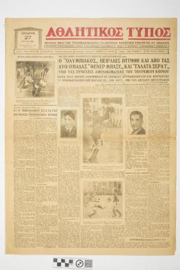 Εφημερίδα "ΑΘΛΗΤΙΚΟΣ ΤΥΠΟΣ". Αθλητική εφημερίδα που φέρει τον τίτλο θέματος στο πρωτοσέλιδο "Ο ΟΛΥΜΠΙΑΚΟΣ ΠΕΙΡΑΙΩΣ ΗΤΤΗΘΗ ΚΑΙ ΑΠΌ ΤΑΣ ΔΥΟ ΟΜΑΔΑΣ ΦΕΝΕΡ ΜΠΑΞΕ ΚΑΙ ΓΑΛΑΤΑ ΣΕΡΑΪ ΥΠΟ ΤΑΣ ΣΥΝΕΧΕΙΣ ΑΠΟΔΟΚΙΜΑΣΙΑΣ ΤΟΥ ΤΟΥΡΚΙΚΟΥ ΚΟΙΝΟΥ". Ημερομηνία έκδοσης: ΤΕΤΑΡΤΗ 17 ΜΑΪΟΥ 1931. Αριθμός φύλλου:202