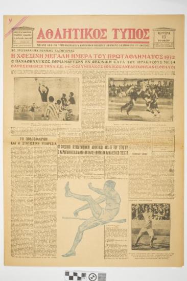 Εφημερίδα "ΑΘΛΗΤΙΚΟΣ ΤΥΠΟΣ". Αθλητική εφημερίδα που φέρει τον τίτλο θέματος στο πρωτοσέλιδο "Η ΧΘΕΣΙΝΗ ΜΕΓΑΛΗ ΗΜΕΡΑ ΤΟΥ ΠΡΩΤΑΘΛΗΜΑΤΟΣ ". Ημερομηνία έκδοσης: ΔΕΥΤΕΡΑ 13 ΙΟΥΝΙΟΥ 1932. Αριθμός φύλλου: 372 (EL)
