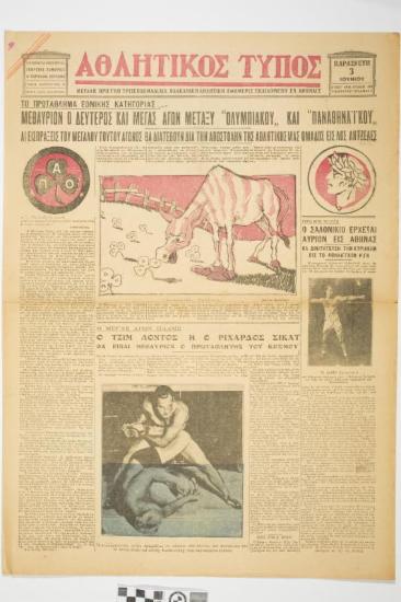 Εφημερίδα "ΑΘΛΗΤΙΚΟΣ ΤΥΠΟΣ". Αθλητική εφημερίδα που φέρει τον τίτλο θέματος στο πρωτοσέλιδο "ΜΕΘΑΥΡΙΟΝ Ο ΔΕΥΤΕΡΟΣ ΚΑΙ ΜΕΓΑΣ ΑΓΩΝ ΜΕΤΑΞΥ 'ΟΛΥΜΠΙΑΚΟΥ' ΚΑΙ ' ΠΑΝΑΘΗΝΑΪΚΟΥ' -ΑΙ ΕΙΣΠΡΑΞΕΙΣ ΤΟΥ ΜΕΓΑΛΟΥ ΤΟΥΤΟΥ ΑΓΩΝΟΣ ΘΑ ΔΙΑΤΕΘΟΥΝ ΔΙΑ ΤΗΝ ΑΠΟΣΤΟΛΗΝ ΤΗΣ ΑΘΛΗΤΙΚΗΣ ΜΑΣ ΟΜΑΔΟΣ ΕΙΣ ΛΟΣ ΑΝΤΖΕΛΕΣ". Ημερομηνία έκδοσης: ΠΑΡΑΣΚΕΥΗ 3 ΙΟΥΝΙΟΥ 1932. Αριθμός φύλλου: 368
