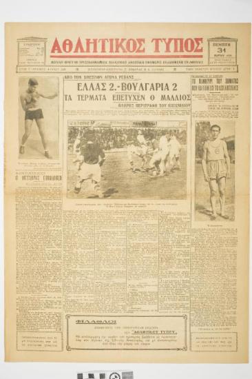 Εφημερίδα "ΑΘΛΗΤΙΚΟΣ ΤΥΠΟΣ". Αθλητική εφημερίδα που φέρει τον τίτλο θέματος στο πρωτοσέλιδο "ΕΛΛΑΣ 2. -ΒΟΥΛΓΑΡΙΑ 2- ΤΑ ΤΕΡΜΑΤΑ ΕΠΕΤΥΧΕΝ Ο ΜΑΛΛΙΟΣ". Ημερομηνία έκδοσης: ΠΕΜΠΤΗ 31 ΜΑΡΤΙΟΥ 1932. Αριθμός φύλλου: 338