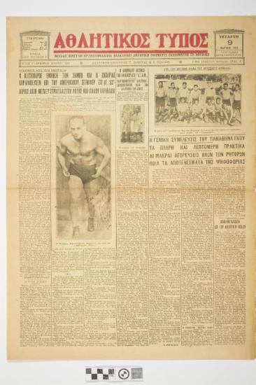 Εφημερίδα "ΑΘΛΗΤΙΚΟΣ ΤΥΠΟΣ". Αθλητική εφημερίδα που φέρει τον τίτλο θέματος στο πρωτοσέλιδο "Ο ΚΟΤΣΩΝΑΡΟΣ ΕΝΙΚΗΣΕ ΤΟΝ ΣΑΜΠΩ ΚΑΙ Ο ΖΑΧΑΡΙΑΣ ΕΘΡΙΑΜΒΕΥΣΕΝ ΕΠΙ ΤΟΥ ΑΜΕΡΙΚΑΝΟΥ ΣΙΕΜΦΕΡ ΕΙΣ 11.53-ΑΓΡΙΟΣ ΑΓΩΝ ΜΕΤΑΞΥ ΣΤΡΑΓΓΑΛΙΣΤΟΥ ΛΟΥΗΣ ΚΑΙ ΙΤΑΛΟΥ ΓΑΡΙΒΑΛΔΙ". Ημερομηνία έκδοσης: ΤΕΤΑΡΤΗ 9 ΜΑΡΤΙΟΥ 1932. Αριθμός φύλλου:327