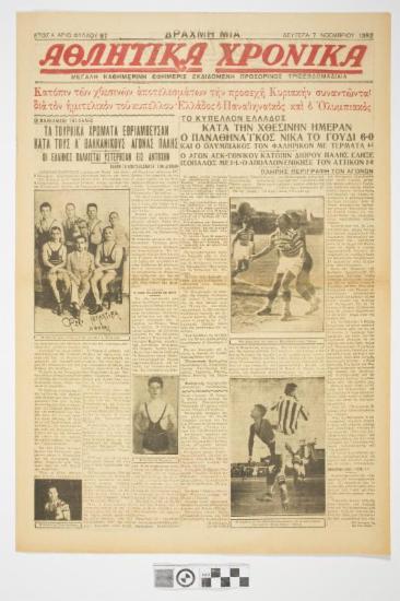 Εφημερίδα "ΑΘΛΗΤΙΚΑ ΧΡΟΝΙΚΑ". Αθλητική εφημερίδα που φέρει τον τίτλο θέματος στο πρωτοσέλιδο "ΚΑΤΟΠΙΝ ΤΩΝ ΧΘΕΣΙΝΩΝ ΑΠΟΤΕΛΕΣΜΑΤΩΝ ΤΗΝ ΠΡΟΣΕΧΗ ΚΥΡΙΑΚΗΝ ΣΥΝΑΝΤΩΝΤΑΙ ΔΙΑ ΤΟΝ ΗΜΙΤΕΛΙΚΟΝ ΤΟΥ ΚΥΠΕΛΛΟΥ ΕΛΛΑΔΟΣ Ο ΠΑΝΑΘΗΝΑΪΚΟΣ ΚΑΙ Ο ΟΛΥΜΠΙΑΚΟΣ" . Ημερομηνία έκδοσης: ΔΕΥΤΕΡΑ 7 ΝΟΕΜΒΡΙΟΥ 1932. Αριθμός φύλλου: 97
