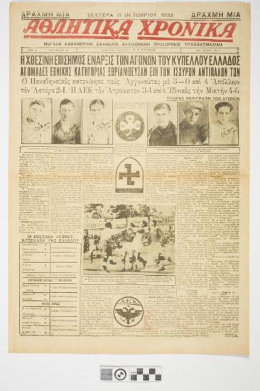 Εφημερίδα "ΑΘΛΗΤΙΚΑ ΧΡΟΝΙΚΑ". Αθλητική εφημερίδα που φέρει τον τίτλο θέματος στο πρωτοσέλιδο "Η ΧΘΕΣΙΝΗ ΕΠΙΣΗΜΟΣ ΕΝΑΡΞΙΣ ΤΩΝ ΑΓΩΝΩΝ ΤΟΥ ΚΥΠΕΛΛΟΥ ΕΛΛΑΔΟΣ ΑΙ ΟΜΑΔΕΣ ΕΘΝΙΚΗΣ ΚΑΤΗΓΟΡΙΑΣ ΕΘΡΙΑΜΒΕΥΣΑΝ ΕΠΙ ΤΩΝ ΙΣΧΥΡΩΝ ΑΝΤΙΠΑΛΩΝ ΤΩΝ" . Ημερομηνία έκδοσης: ΔΕΥΤΕΡΑ 31 ΟΚΤΩΒΡΙΟΥ 1932. Αριθμός φύλλου: 94