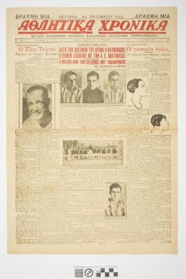 Εφημερίδα "ΑΘΛΗΤΙΚΑ ΧΡΟΝΙΚΑ". Αθλητική εφημερίδα που φέρει τον τίτλο θέματος στο πρωτοσέλιδο "ΚΑΤΆ ΤΟΝ ΧΘΕΣΙΝΟΝ ΤΟΥ ΑΓΩΝΑ Ο ΟΛΥΜΠΙΑΚΟΣ ΕΞΗΛΘΕΝ ΙΣΟΠΑΛΟΣ ΜΕ ΤΗΝ Α.Ε. ΚΩΝ)ΠΟΛΕΩΣ- Ο ΧΘΕΣΙΝΟΣ ΑΓΩΝ ΥΠΗΡΞΕΝ ΑΤΟΝΟΣ ΑΝΕΥ ΕΝΔΙΑΦΕΡΟΝΤΟΣ" . Ημερομηνία έκδοσης: ΔΕΥΤΕΡΑ 24 ΟΚΤΩΒΡΙΟΥ 1932. Αριθμός φύλλου: 91 (EL)