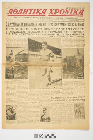 Εφημερίδα "ΑΘΛΗΤΙΚΑ ΧΡΟΝΙΚΑ". Αθλητική εφημερίδα που φέρει τον τίτλο θέματος στο πρωτοσέλιδο "Ο ΟΛΥΜΠΙΑΚΟΣ ΕΘΡΙΑΜΒΕΥΣΕΝ ΕΙΣ ΤΟΥΣ ΚΟΛΥΜΒΗΤΙΚΟΥΣ ΑΓΩΝΑΣ- Η ΕΥΡΩΠΗ ΕΙΣ ΤΟΝ ΣΤΙΒΟΝ ΤΟΥ ΛΟΣ ΑΝΤΖΕΛΕΣ- ΤΙ ΑΠΕΔΩΣΕΝ Η Η ΦΙΛΛΑΝΔΙΑ, Η ΓΕΡΜΑΝΙΑ ΚΑΙ Η ΣΟΥΗΔΙΑ ΕΙΣ ΤΟ ΚΛΑΣΣΙΚΟΝ ΑΘΛΗΤΙΣΜΟΝ ΤΗΣ Χ ΟΛΥΜΠΙΑΔΟΣ". Ημερομηνία έκδοσης: ΔΕΥΤΕΡΑ 15 ΑΥΓΟΥΣΤΟΥ 1932. Αριθμός φύλλου: 59