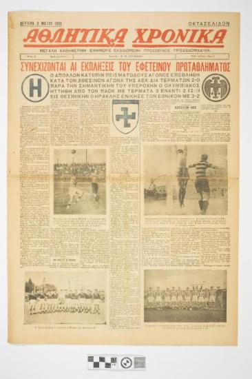 Εφημερίδα "ΑΘΛΗΤΙΚΑ ΧΡΟΝΙΚΑ". Αθλητική εφημερίδα που φέρει τον τίτλο θέματος στο πρωτοσέλιδο "ΣΥΝΕΧΙΖΟΝΤΑΙ ΑΙ ΕΚΠΛΗΞΕΙΣ ΤΟΥ ΕΦΕΤΕΙΝΟΥ ΠΡΩΤΑΘΛΗΜΑΤΟΣ". Ημερομηνία έκδοσης: ΔΕΥΤΕΡΑ 9 ΜΑΪΟΥ 1932. Αριθμός φύλλου: 17 (EL)