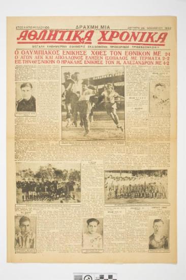 Εφημερίδα "ΑΘΛΗΤΙΚΑ ΧΡΟΝΙΚΑ", μεγάλη καθημερινή εφημερίς εκδιδόμενη προσωρινώς τρισεβδομαδιαία. Το κεντρικό θέμα του πρωτοσέλιδου φέρει τον τίτλο «Ο Ολυμπιακός ενίκησε χθες τον Εθνικόν με 2-1. Ο αγών ΑΕΚ και Απόλλωνος έληξεν ισόπαλος με τέρματα 2-2. Εις την Θεσσαλονίκην ο Ηρακλής ενίκησε τον Μ. Αλέξανδρον με 4-2». Ημερομηνία έκδοσης: Δευτέρα, 28 Νοεμβρίου 1932. Αριθμός Φύλλου: 106. Χρησιμοποιείται η καθαρεύουσα.