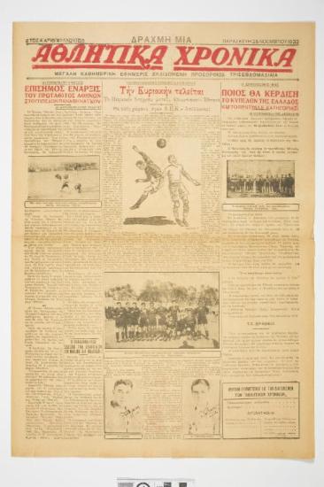 Εφημερίδα "ΑΘΛΗΤΙΚΑ ΧΡΟΝΙΚΑ", αθλητική εφημερίδα. Θέματα πρωτοσέλιδου: «Την Κυριακήν τελείται. Το Πειραικόν Ντέρμπυ μεταξύ Ολυμπιακού - Εθνικού. Θα λάβη χώραν ο αγών Α.Ε.Κ. - Απόλλωνος;», «Επίσημος Έναρξις του πρωταθλήματος Αθηνών στο γήπεδον Παναθηναϊκού», «Ποιός θα κερδίση το κύπελλον εις Ελλάδος και το πρωτάθλημα Ε. κατηγορίας;». Ημερομηνία έκδοσης: Παρασκευή, 25 Νοεμβρίου 1932. Αριθμός Φύλλου: 105. Χρησιμοποιείται η καθαρεύουσα.