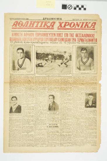 Εφημερίδα "ΑΘΛΗΤΙΚΑ ΧΡΟΝΙΚΑ". Αθλητική εφημερίδα που φέρει τον τίτλο θέματος στο πρωτοσέλιδο "Η ΜΙΚΤΗ ΑΘΗΝΩΝ ΕΘΡΙΑΜΒΕΥΣΕΝ ΧΘΕΣ ΕΠΙ ΤΗΣ ΘΕΣΣΑΛΟΝΙΚΗΣ ΟΙ ΑΘΗΝΑΙΟΙ ΑΠΟΛΥΤΟΙ ΚΥΡΙΑΡΧΟΙ ΤΟΥ ΓΗΠΕΔΟΥ ΕΣΗΜΕΙΩΣΑΝ ΤΡΙΑ ΤΕΡΜΑΤΑ ΕΝΑΝΤΙΟ".Ημερομηνία έκδοσης: ΔΕΥΤΕΡΑ 13 ΦΕΒΡΟΥΑΡΙΟΥ 1933. Αριθμός φύλλου: 139 (EL)