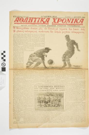 Εφημερίδα "ΑΘΛΗΤΙΚΑ ΧΡΟΝΙΚΑ". Αθλητική εφημερίδα που φέρει τον τίτλο θέματος στο πρωτοσέλιδο "Η ΜΠΕΟΓΡΑΔΣΚΥ ΕΝΙΚΗΣΕΝ ΧΘΕΣ ΤΟΝ ΕΘΝΙΚΟΝ ΜΕ ΤΕΡΜΑΤΑ ΔΥΟ ΕΝΑΝΤΙ ΕΝΌΣ- Η ΧΘΕΣΙΝΗ ΠΟΔΟΣΦΑΙΡΙΚΗ ΣΥΝΑΝΤΗΣΙΣ ΔΕΝ ΥΠΗΡΞΕ ΜΕΓΑΛΟΥ ΕΝΔΙΑΦΕΡΟΝΤΟΣ". Ημερομηνία έκδοσης: ΤΕΤΑΡΤΗ 4 ΙΑΝΟΥΑΡΙΟΥ 1933. Αριθμός φύλλου: 122