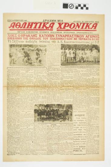 Εφημερίδα "ΑΘΛΗΤΙΚΑ ΧΡΟΝΙΚΑ". Αθλητική εφημερίδα που φέρει τον τίτλο θέματος στο πρωτοσέλιδο "ΧΘΕΣ Ο ΗΡΑΚΛΗΣ ΚΑΤΟΠΙΝ ΣΥΝΑΡΠΑΣΤΙΚΟΥ ΑΓΩΝΟΣ ΕΠΕΒΛΗΘΗ ΤΗΣ ΟΜΔΟΣ ΤΟΥ ΠΑΝΑΘΗΝΑΪΚΟΥ ΜΕ ΤΕΡΜΑΤΑ 5-1 (1-1)". Ημερομηνία έκδοσης: ΔΕΥΤΕΡΑ 16 ΙΑΝΟΥΑΡΙΟΥ 1933. Αριθμός φύλλου: 127