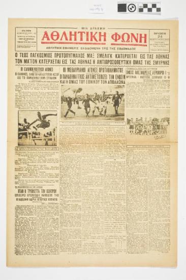 Εφημερίδα "ΑΘΛΗΤΙΚΗ ΦΩΝΗ". Αθλητική εφημερίδα που φέρει τον τίτλο θέματος στο πρωτοσέλιδο "Ο ΤΕΩΣ ΠΑΓΚΟΣΜΙΟΣ ΠΡΩΤΟΠΥΓΜΑΧΟΣ ΜΑΞ ΣΜΕΛΙΓΚ ΚΑΤΕΡΧΕΤΑΙ ΕΙΣ ΤΑΣ ΑΘΗΝΑΣ -ΤΟΝ ΜΑΪΟΝ ΚΑΤΕΡΧΕΤΑΙ ΕΙΣ ΤΑΣ ΑΘΗΝΑΣ Η ΑΝΤΙΠΡΟΣΩΠΕΥΤΙΚΗ ΟΜΑΣ ΤΗΣ ΣΜΥΡΝΗΣ". Ημερομηνία έκδοσης:ΠΑΡΑΣΚΕΥΗ 24 ΦΕΒΡΟΥΑΡΙΟΥ 1933. Αριθμός φύλλου: 125