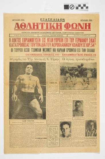 Εφημερίδα "ΑΘΛΗΤΙΚΗ ΦΩΝΗ". Αθλητική εφημερίδα που φέρει τον τίτλο θέματος στο πρωτοσέλιδο "Ο ΛΟΝΤΟΣ ΕΘΡΙΑΜΒΕΥΣΕΝ ΕΙΣ ΝΕΑΝ ΥΟΡΚΗΝ ΕΠΙ ΤΟΥ ΓΕΡΜΑΝΟΥ ΣΙΚΑΤ ΚΑΤΑΤΡΟΠΩΣΑΣ ΤΟΥΤΟΝ ΔΙΑ ΤΟΥ ΑΕΡΟΠΛΑΝΙΚΟΥ ΚΟΛΠΟΥ ΣΕ 1 ΩΡ.54'' "και τον υπότιτλο "ΟΙ ΤΟΥΡΚΟΙ ΑΣΣΟΙ ΤΣΟΜΠΑΝ ΜΕΧΜΕΤ ΚΑΙ ΚΑΡΑΛΗ ΕΡΧΟΝΤΑΙ ΕΙΣ ΤΗΝ ΕΛΛΑΔΑ". Ημερομηνία έκδοσης: ΔΕΥΤΕΡΑ 20 ΝΟΕΜΒΡΙΟΥ 1933. Αριθμός φύλλου: 133 (1)