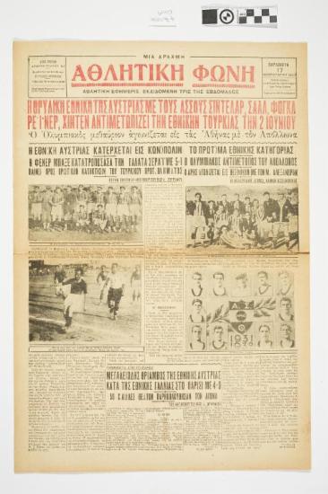 Εφημερίδα "ΑΘΛΗΤΙΚΗ ΦΩΝΗ". Αθλητική εφημερίδα που φέρει τον τίτλο θέματος στο πρωτοσέλιδο "Η ΘΡΥΛΙΚΗ ΕΘΝΙΚΗ ΤΗΣ ΑΥΣΤΡΙΑΣ ΜΕ ΤΟΥΣ ΑΣΣΟΥΣ ΣΙΝΤΕΛΑΡ, ΣΑΛΛ, ΦΟΓΚΑ, ΡΕΪΝΕΡ, ΧΙΝΤΕΝ ΑΝΤΙΜΕΤΩΠΙΖΕΙ ΤΗΝ ΕΘΝΙΚΗΝ ΤΟΥΡΚΙΑΣ ΤΗΝ 2 ΙΟΥΝΙΟΥ". Ημερομηνία έκδοσης: ΠΑΡΑΣΚΕΥΗ 17 ΦΕΒΡΟΥΑΡΙΟΥ 1933. Αριθμός φύλλου: 123