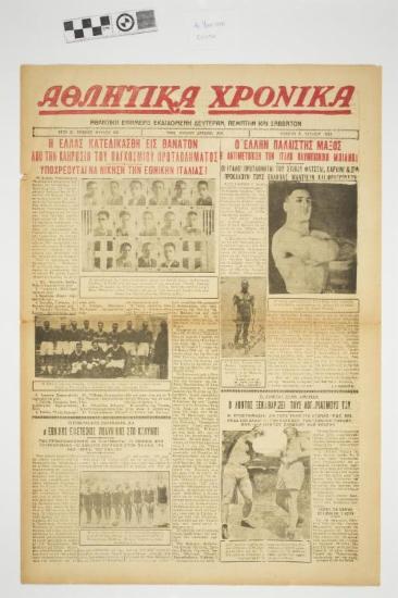 Εφημερίδα "ΑΘΛΗΤΙΚΑ ΧΡΟΝΙΚΑ". Αθλητική εφημερίδα που φέρει τον τίτλο θέματος στο πρωτοσέλιδο "Η ΕΛΛΑΣ ΚΑΤΕΔΙΚΑΣΘΗ ΕΙΣ ΘΑΝΑΤΟΝ ΑΠΌ ΤΗΝ ΚΛΗΡΩΣΗ ΤΟΥ ΠΑΓΚΟΣΜΙΟΥ ΠΡΩΤΑΘΛΗΜΑΤΟΣΙ ΥΠΟΧΡΕΟΥΤΑΙ ΝΑ ΝΙΚΗΣΗ ΤΗΝ ΕΘΝΙΚΗΝ ΙΤΑΛΙΑΣ" και "Ο ΕΛΛΗΝ ΠΑΛΑΙΣΤΗΣ ΜΑΞΟΣ Θ'ΑΝΤΙΜΕΤΩΠΙΣΗ ΤΟΝ ΙΤΑΛΟ ΟΛΥΜΠΙΑΚΟΝΙΚΗ ΜΠΙΑΝΚΙ". Ημερομηνία έκδοσης: ΠΕΜΠΤΗ 6 ΙΟΥΛΙΟΥ 1933. Αριθμός φύλλου:186