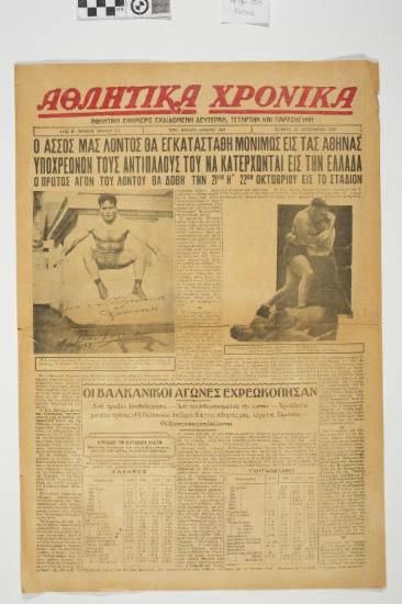 Εφημερίδα "ΑΘΛΗΤΙΚΑ ΧΡΟΝΙΚΑ". Αθλητική εφημερίδα που φέρει τον τίτλο θέματος στο πρωτοσέλιδο " Ο ΑΣΣΟΣ ΜΑΣ ΛΟΝΤΟΣ ΘΑ ΕΓΚΑΤΑΣΤΑΘΗ ΜΟΝΙΜΩΣ ΕΙΣ ΤΑΣ ΑΘΗΝΑΣ ΥΠΟΧΡΕΩΝΩΝ ΤΟΥΣ ΑΝΤΙΠΑΛΟΥΣ ΤΟΥ ΝΑ ΚΑΤΕΡΧΟΝΤΑΙ ΕΙΣ ΤΗΝ ΕΛΛΑΔΑ". Ημερομηνία έκδοσης: ΤΕΤΑΡΤΗ 27 ΣΕΠΤΕΜΒΡΙΟΥ 1933. Αριθμός φύλλου: 214