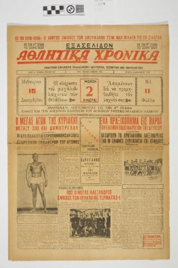 Εφημερίδα "ΑΘΛΗΤΙΚΑ ΧΡΟΝΙΚΑ". Αθλητική εφημερίδα που φέρει τον τίτλο θέματος στο πρωτοσέλιδο "Ο ΜΕΓΑΣ ΑΓΩΝ ΤΗΣ ΚΥΡΙΑΚΗΣ ΜΕΤΑΞΥ ΣΙΚΙ ΚΑΙ ΔΗΜΗΤΡΕΛΛΗΣ" και "ΈΝΑ ΠΡΑΞΙΚΟΠΗΜΑ ΕΙΣ ΒΑΡΟ ΤΩΝ ΕΛΛΗΝΩΝ ΠΟΔΟΣΦΑΙΡΙΣΤΩΝ ΤΗΣ ΑΙΓΥΠΤΟΥ- ΚΑΤΑΡΓΟΥΝ ΤΟ ΠΡΩΤΑΘΛΗΜΑ ΑΛΕΞΑΝΔΡΕΙΑΣ ΕΝΩ ΟΙ ΕΛΛΗΝΕΣ ΕΥΡΙΣΚΟΝΤΑΙ ΕΠΙ ΚΕΦΑΛΗΣ". Ημερομηνία έκδοσης: ΤΕΤΑΡΤΗ 13 ΔΕΚΕΜΒΡΙΟΥ 1933. Αριθμός φύλλου: 249