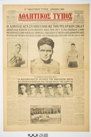 Εφημερίδα "ΑΘΛΗΤΙΚΟΣ ΤΥΠΟΣ". Αθλητική εφημερίδα που φέρει τους τίτλους θεμάτων στο πρωτοσέλιδο " Ο ΛΟΝΤΟΣ ΔΕΝ ΕΣΥΝΑΝΤΗΘΗ ΜΕ ΤΟΝ ΡΙΧΑΡΔΟΝ ΣΙΚΑΤ-ΑΠΛΩΣ ΚΑΙ ΜΟΝΟΝ ΚΑΤΕΝΙΚΗΣΕΝ ΧΘΕΣ ΤΟΝ ΡΕΫ ΣΤΗΛ ΕΝΩΠΙΟΝ 3.000 ΘΕΑΤΩΝ ΕΙΣ ΣΑΙ-ΝΙΚΟΛΑΣ ΑΡΗΝΑΣ - Ο ΒΑΣΙΛΕΥΣ ΤΗΣ ΠΑΛΗΣ ΔΗΜΗΤΡΕΛΗΣ ΘΑ ΕΠΙΔΕΙΞΗ ΤΗΝ ΠΡΑΓΜΑΤΙΚΗΝ ΤΕΧΝΗΝ ΤΟΥ ΑΓΩΝΙΣΜΑΤΟΣ ΕΝΕΝΤΙΟΝ ΤΟΥ ΡΕΤΖΙΝΑΛ ΣΙΚΙ" και " ΟΙ ΑΛΗΣΜΟΝΗΤΟΙ ΑΓΩΝΕΣ ΤΗΣ ΝΙΚΟΛΣΟΝ (ΒΙΕΝ) ΘΑ ΕΠΑΝΑΛΗΦΘΟΥΝ ΚΑΙ ΠΑΛΙΝ ΚΑΤΑ ΤΑΣ ΕΟΡΤΑΣ". Ημερομηνία έκδοσης: ΤΕΤΑΡΤΗ 22 ΝΟΕΜΒΡΙΟΥ 1933. Αριθμός φύλλου: 605 (EL)