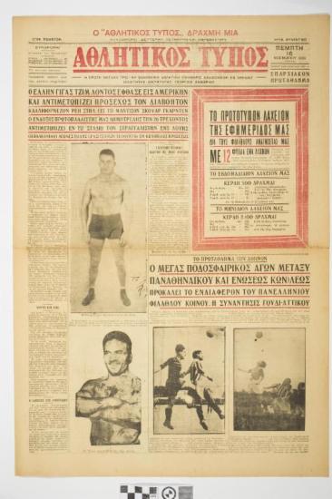Εφημερίδα "ΑΘΛΗΤΙΚΟΣ ΤΥΠΟΣ". Αθλητική εφημερίδα που φέρει τους τίτλους θεμάτων στο πρωτοσέλιδο " Ο ΕΛΛΗΝ ΓΙΓΑΣ ΤΖΙΜ ΛΟΝΤΟΣ ΕΦΘΑΣΕ ΕΙΣ ΑΜΕΡΙΚΗΝ ΚΑΙ ΑΝΤΙΜΕΤΩΠΙΖΕΙ ΠΡΟΣΕΧΩΣ ΤΟΝ ΔΙΑΒΟΗΤΟΝ ΚΑΛΛΙΦΟΡΝΕΖΟΝ ΡΕΗ ΣΤΗΛ ΕΙΣ ΤΟ ΜΑΝΤΙΣΟΝ ΣΚΟΥΑΡ ΓΚΑΡΝΤΕΝ" και " Ο ΠΟΔΟΣΦΑΙΡΙΚΟΣ ΑΓΩΝ ΜΕΤΑΞΥ ΠΑΝΑΘΗΝΑΪΚΟΥ ΚΑΙ ΕΝΩΣΕΩΣ ΚΩΝ)ΛΕΩΣ". Ημερομηνία έκδοσης: ΠΕΜΠΤΗ 16 ΝΟΕΜΒΡΙΟΥ 1933. Αριθμός φύλλου: 603