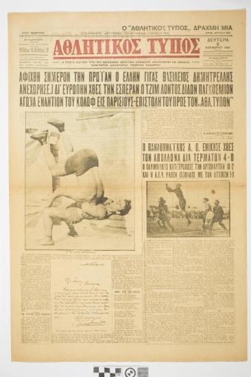 Εφημερίδα "ΑΘΛΗΤΙΚΟΣ ΤΥΠΟΣ". Αθλητική εφημερίδα που φέρει τον τίτλο θέματος στο πρωτοσέλιδο " ΑΦΙΧΘΗ ΣΗΜΕΡΟΝ ΤΗΝ ΠΡΩΪΑΝ Ο ΕΛΛΗΝ ΓΙΓΑΣ ΒΑΣΙΛΕΙΟΣ ΔΗΜΗΤΡΕΛΛΗΣ -ΑΝΕΧΩΡΗΣΕΝ ΔΙ'ΕΥΡΩΠΗΝ ΧΘΕΣ ΤΗΝ ΕΣΠΕΡΑΝ Ο ΤΖΙΜ ΛΟΝΤΟΣ ΔΙΔΩΝ ΠΑΓΚΟΣΜΙΟΝ ΑΓΩΝΑ ΕΝΑΝΤΙΟΝ ΤΟΥ ΚΟΛΩΦ ΕΙΣ ΠΑΡΙΣΙΟΥΣ- ΕΠΙΣΤΟΛΗ ΤΟΥ ΠΡΟΣ ΤΟΝ 'ΑΘΛ. ΤΥΠΟΝ' ". Ημερομηνία έκδοσης: ΔΕΥΤΕΡΑ 6 ΝΟΕΜΒΡΙΟΥ 1933. Αριθμός φύλλου: 599