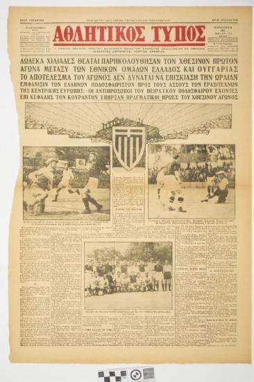 Εφημερίδα "ΑΘΛΗΤΙΚΟΣ ΤΥΠΟΣ". Αθλητική εφημερίδα που φέρει τον τίτλο θέματος στο πρωτοσέλιδο "ΔΩΔΕΚΑ ΧΙΛΙΑΔΕΣ ΘΕΑΤΑΙ ΠΑΡΗΚΟΛΟΥΘΗΣΑΝ ΤΟΝ ΧΘΕΣΙΝΟΝ ΠΡΩΤΟΝ ΑΓΩΝΑ ΜΕΤΑΞΥ ΤΩΝ ΕΘΝΙΚΩΝ ΟΜΑΔΩΝ ΕΛΛΑΔΟΣ ΚΑΙ ΟΥΓΓΑΡΙΑΣ". Ημερομηνία έκδοσης: ΠΑΡΑΣΚΕΥΗ 26 ΜΑΪΟΥ 1933. Αριθμός φύλλου: 526 (EL)