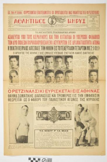 Εφημερίδα " ΑΘΛΗΤΙΚΟΣ ΚΗΡΥΞ ". Αθλητική εφημερίδα που φέρει τον τίτλο θέματος στο πρωτοσέλιδο "ΑΣΑΛΕΥΤΟΙ ΥΠΟ ΤΟΥΣ ΚΕΡΑΥΝΟΥΣ ΚΑΙ ΤΗΝ ΚΑΤΑΙΓΙΔΑ ΟΙ ΥΠΕΡΟΧΟΙ ΦΙΛΑΘΛΟΙ ΤΩΝ ΔΥΟ ΠΟΛΕΩΝ ΠΑΡΗΚΟΛΟΥΘΗΣΑΝ ΕΝΑ ΑΣΥΓΚΡΙΤΟΝ ΕΙΣ ΔΡΑΜΑΤΙΚΟΤΗΤΑ ΑΓΩΝΑ". Ημερομηνία έκδοσης: ΔΕΥΤΕΡΑ 11 ΔΕΚΕΜΒΡΙΟΥ 1933. Αριθμός φύλλου: 4