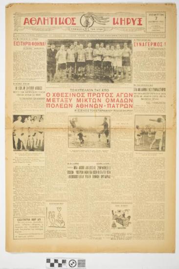 Εφημερίδα " ΑΘΛΗΤΙΚΟΣ ΚΗΡΥΞ ". Αθλητική εφημερίδα που φέρει τον τίτλο θέματος στο πρωτοσέλιδο "Ο ΧΘΕΣΙΝΟΣ ΠΡΩΤΟΣ ΑΓΩΝ ΜΕΤΑΞΥ ΜΙΚΤΩΝ ΟΜΑΔΩΝ ΠΟΛΕΩΝ ΑΘΗΝΩΝ-ΠΑΤΡΩΝ". Ημερομηνία έκδοσης: ΠΕΜΠΤΗ 7 ΔΕΚΕΜΒΡΙΟΥ 1933. Αριθμός φύλλου: 2 (EL)