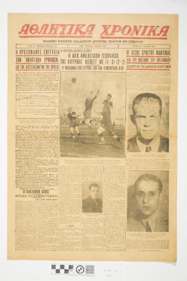 Εφημερίδα "ΑΘΛΗΤΙΚΑ ΧΡΟΝΙΚΑ", αθλητική εφημερίδα. Θέματα πρωτοσέλιδου: «Η ΑΕΚ ΑΝΕΔΕΙΧΘΗ ΙΣΟΠΑΛΟΣ ΤΗΣ ΟΥΓΓΡΙΚΗΣ ΚΙΣΠΕΣΤ ΜΕ (3-3) (2-2). Ο ΠΑΝΑΘΗΝΑΪΚΟΣ ΗΤΤΗΘΗ ΑΠΟ ΤΗΝ ΤΕΜΙΣΟΥΑΡΑ (1-0).», «Η ΠΡΩΤΟΦΑΝΗΣ ΕΠΙΤΥΧΙΑ ΤΩΝ "Αθλητικών Χρονικών" ΕΠΙ ΤΩΝ ΑΠΟΤΕΛΕΣΜΑΤΩΝ ΤΗΣ ΠΡΑΓΑΣ», «Ο ΑΣΣΟΣ ΧΡΗΣΤΟΣ ΜΑΝΤΙΚΑΣ ΔΙΑ ΤΟΥ ΧΘΕΣΙΝΟΥ ΘΡΙΑΜΒΟΥ- ΕΛΑΜΠΡΥΝΕ ΤΟΝ ΕΛΛΗΝΙΚΟΝ ΑΘΛΗΤΙΣΜΟΝ». Ημερομηνία έκδοσης: Τρίτη, 6 Ιουνίου 1933. Έκτακτη έκδοση. Αριθμός Φύλλου: 172.