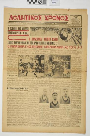 Εφημερίδα "ΑΘΛΗΤΙΚΟΣ ΧΡΟΝΟΣ". Αθλητική εφημερίδα που φέρει τον τίτλο θέματος στο πρωτοσέλιδο " Ο ΟΛΥΜΠΙΑΚΟΣ ΚΑΤΟΠΙΝ ΩΡΑΙΟΥ ΑΓΩΝΟΣ ΗΛΘΕΝ ΙΣΟΠΑΛΟΣ ΜΕ ΤΟΝ ΑΡΗΝ ΘΕΣ)ΝΙΚΗΣ ΜΕ ΤΕΡΜ 2-2 - Ο ΠΑΝΑΘΗΝΑΪΚΟΣ ΕΝΙΚΗΣΕ ΤΟΝ ΑΠΟΛΛΩΝΑ ΜΕ ΤΕΡΜ. 5-3". Ημερομηνία έκδοσης: ΔΕΥΤΕΡΑ 29 ΟΚΤΩΒΡΙΟΥ 1934. Αριθμός φύλλου: 32