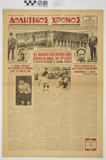 Εφημερίδα "ΑΘΛΗΤΙΚΟΣ ΧΡΟΝΟΣ". Αθλητική εφημερίδα που φέρει τον τίτλο θέματος στο πρωτοσέλιδο " ΟΙ Δ' ΒΑΛΚΑΝΙΚΟΙ ΠΟΔΟΣΦΑΙΡΙΚΟΙ ΑΓΩΝΕΣ ΑΡΧΟΝΤΑΙ ΕΝ ΑΘΗΝΑΙΣ ΤΗΝ 23ΗΝ Δ)ΒΡΙΟΥ". Ημερομηνία έκδοσης: ΤΕΤΑΡΤΗ 24 ΟΚΤΩΒΡΙΟΥ 1934. Αριθμός φύλλου:30 (EL)