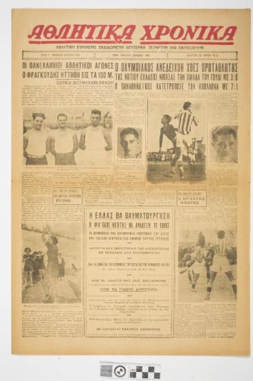 Εφημερίδα "ΑΘΛΗΤΙΚΑ ΧΡΟΝΙΚΑ". Αθλητική εφημερίδα που φέρει τον τίτλο θέματος στο πρωτοσέλιδο "Ο ΟΛΥΜΠΙΑΚΟΣ ΑΝΕΔΕΙΧΘΗ ΧΘΕΣ ΠΡΩΤΑΘΛΗΤΗΣ ΤΗΣ ΝΟΤΙΟΥ ΕΛΛΑΔΟΣ ΝΙΚΗΣΑΣ ΤΗΝ ΟΜΑΔΑ ΤΟΥ ΓΟΥΔΙ ΜΕ 3:1"-"ΟΙ ΠΑΝΕΛΛΗΝΙΟΙ ΑΘΛΗΤΙΚΟΙ ΑΓΩΝΕΣ-Ο ΦΡΑΓΚΟΥΔΗΣ ΗΤΤΗΘΗ ΕΙΣ ΤΑ 100Μ.". Ημερομηνία έκδοσης: ΔΕΥΤΕΡΑ 28 ΜΑΪΟΥ 1934. Αριθμός φύλλου: 320