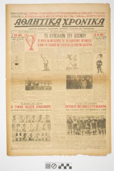 Εφημερίδα "ΑΘΛΗΤΙΚΑ ΧΡΟΝΙΚΑ". Αθλητική εφημερίδα που φέρει τους τίτλους θεμάτων στο πρωτοσέλιδο "ΤΟ ΚΥΠΕΛΛΟΝ ΤΟΥ ΚΟΣΜΟΥ- 32 ΚΡΑΤΗ ΘΑ ΜΕΤΑΣΧΟΥΝ ΤΗΣ ΜΕΓΑΛΟΠΡΕΠΟΥΣ ΟΡΓΑΝΩΣΕΩΣ-Ο ΑΓΩΝ ΤΗΣ ΕΛΛΑΔΟΣ ΚΑΙ ΙΤΑΚΙΑΣ ΘΑ ΕΧΕΙ ΕΛΒΕΤΟΝ ΔΙΑΙΤΗΤΗΝ", "ΤΟ ΘΑΥΜΑ ΤΟΥ ΤΟΡΙΝΟ-ΟΙ ΤΥΦΛΟΙ ΠΑΙΖΟΥΝ ΠΟΔΟΣΦΑΙΡΟ" και "ΠΕΙΡΑΙΕΥΣ -ΘΕΣ)ΝΙΚΗ ΕΙΣ ΤΟ ΦΑΛΗΡΟΝ". Ημερομηνία έκδοσης: ΤΕΤΑΡΤΗ 17 ΙΑΝΟΥΑΡΙΟΥ 1934. Αριθμός φύλλου: 267