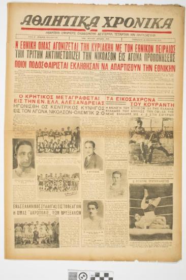 Εφημερίδα "ΑΘΛΗΤΙΚΑ ΧΡΟΝΙΚΑ". Αθλητική εφημερίδα που φέρει τον τίτλο θέματος στο πρωτοσέλιδο "Η ΕΘΝΙΚΗ ΟΜΑΣ ΑΓΩΝΙΖΕΤΑΙ ΤΗΝ ΚΥΡΙΑΚΗΝ ΜΕ ΤΟΝ ΕΘΝΙΚΟΝ ΠΕΙΡΑΙΩΣ -ΤΗΝ ΤΡΙΤΗΝ ΑΝΤΙΜΕΤΩΠΙΖΕΙ ΤΗΝ ΝΙΚΟΛΣΟΝ ΕΙΣ ΑΓΩΝΑ ΠΡΟΠΟΝΗΣΕΩΣ-ΠΟΙΟΙ ΠΟΔΟΣΦΑΙΡΙΣΤΑΙ ΕΚΛΗΘΗΣΑΝ ΝΑ ΑΠΑΡΤΙΣΟΥΝ ΤΗΝ ΕΘΝΙΚΗΝ". Ημερομηνία έκδοσης: ΠΑΡΑΣΚΕΥΗ 26 ΙΑΝΟΥΑΡΙΟΥ 1934. Αριθμός φύλλου: 270