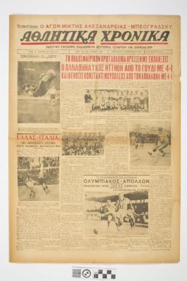 Εφημερίδα "ΑΘΛΗΤΙΚΑ ΧΡΟΝΙΚΑ", αθλητική εφημερίδα. Το κεντρικό θέμα του πρωτοσέλιδου φέρει τον τίτλο «Το ποδοσφαιρικόν πρωτάθλημα ήρχισεν με εκπλήξεις. Ο Παναθηναϊκός ηττήθη από το Γουδί με 4-1 και η Ένωσις Κωνσταντινουπόλεως από τον Απόλλωνα με 4-1.». Ένα ακόμη θέμα που παρουσιάζεται στην πρώτη σελίδα είναι «Ελλάς - Ιταλία; Ένα απροσδόκητο ερώτημα στους φιλάθλους αναγνώστας μας.». Ημερομηνία έκδοσης: Παρασκευή, 23 Φεβρουαρίου 1934. Αριθμός Φύλλου: 279. Χρησιμοποιείται η καθαρεύουσα.