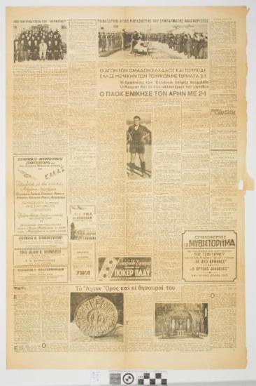 Σελίδα της αθλητικής εφημερίδας "ΜΑΚΕΔΟΝΙΑ" στην οποία παρουσιάζεται το άρθρο με τίτλο «Ο ΑΓΩΝ ΤΩΝ ΟΜΑΔΩΝ ΕΛΛΑΔΟΣ ΚΑΙ ΤΟΥΡΚΙΑΣ ΕΛΗΞΕ ΜΕ ΝΙΚΗΝ ΤΩΝ ΤΟΥΡΚΩΝ ΜΕ ΤΕΡΜΑΤΑ 2-1» και υπότιλο «Η εμφάνισις των Ελλήνων υπήρξε θαυμάσια. Ο Μουρατίδης εκ των καλλιτέρων του γηπέδου».