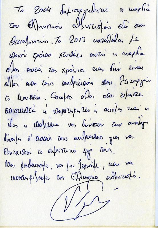 Χειρόγραφη αφιέρωση με ευχές για το Ολυμπιακό Μουσείο