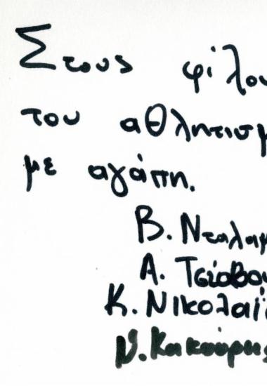 Χειρόγραφη αφιέρωση και υπογραφές των αθλητών κωπηλασίας Βασίλη Νταλαμάγκα, Αιμιλία Τσιάβου, Κατερίνα Νικολαΐδου και Νικόλαος Κακούρη. (EL)