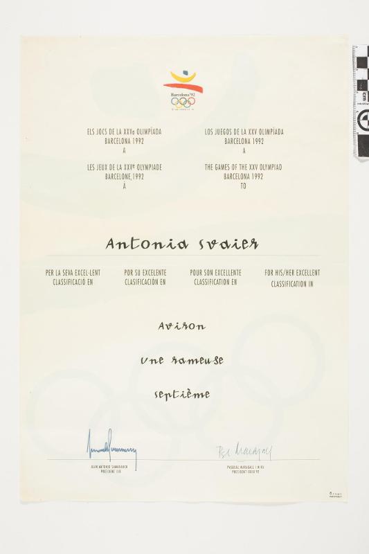 Δίπλωμα που απονεμήθηκε στην Αντωνία Σβάιερ για την επίδοσή της στους Ολυμπιακούς Αγώνες Βαρκελώνη το 1992