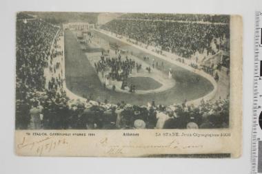 Καρτ ποστάλ. Στην εμπρόσθια πλευρά εικονίζεται το Παναθηναϊκό Στάδιο, στην Αθήνα, γεμάτο από θεατές να παρακολουθούν την έναρξη των Μεσολυμπιακών Αγώνων το 1906. Η καρτ ποστάλ εστάλη στις 6/5/1906. (EL)