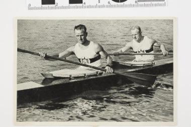 Φωτογραφία με δύο κωπηλάτες καγιάκ στη βάρκα τους. Στην στολή τους υπάρχουν τα σήματα της ναζιστικής Γερμανίας. Στην οπίσθια πλευρά υπάρχει ο τίτλος: "ludwig Landen und Paul Wevers, zwei Kolner Jungen, gewannen uber 10.000 Meter im Kajak- Zweier uberlegen von Osterreich und Schweden mit einem Vorsprung von fast 100 Meter".