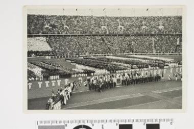 Φωτογραφία με στιγμιότυπο από την τελετή έναρξης με τις εθνικές αποστολές παραταγμένες και το στάδιο γεμάτο κόσμο. Στην οπίσθια πλευρά υπάρχει ο τίτλος: "Die Fahnentrager den Nationen schlossen sich zu einem Halbkreis zusammen, und Rudolf Ismayr leistete den Olympischen Eid."