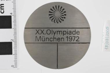 Μετάλλιο συμμετοχής του δρομέα Νακόπουλου Παναγιώτη. Στη μία όψη έχει το σήμα των Ολυμπιακών Αγώνων, τους Ολυμπιακούς Κύκλους, και δυο χέρια σε χειρονομία ανταλλαγής ενός κλαδιου ελιάς, ενώ στην άλλη όψη υπάρχει το σήμα τα διοργάνωσης των Ολυμπιακών Γώνων του Μονάχου, μια σπείρα και την επιγραφή XX Olympiade Munchen 1972. (EL)