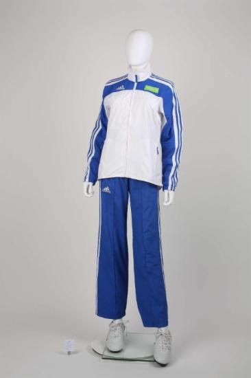 Ζακέτα, τμήμα της επίσημης στολής της Ελληνικής Αποστολής από τους Ολυμπιακούς Αγώνες της Αθήνας το 2004, η οποία φέρει την υπογραφή της ολυμπιονίκη Φανής Χαλκιά. (EL)
