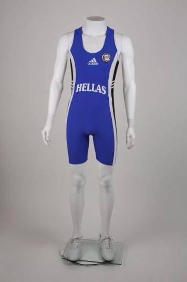 Αγωνιστική στολή για τα αγωνίσματα της Άρσης Βαρών. Η στολή φέρει το σήμα της Ελληνικής Ομοσπονδίας Άρσης Βαρών. (EL)