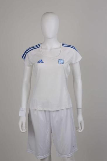 Κοντομάνικο βαμβακερό μπλουζάκι λευκού χρώματος, φέρει πλάτη τη λέξη "HELLAS". Άνηκε στη σφυροβόλο Κοροσίδου Ηλιάνα