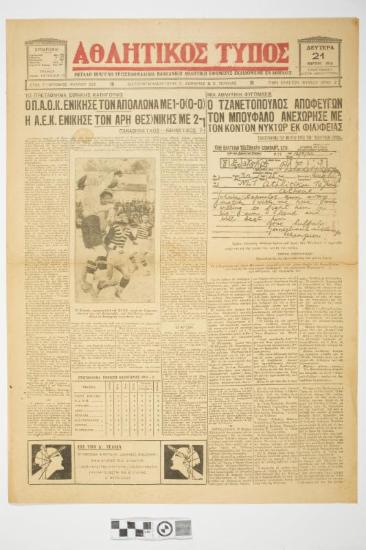 Εφημερίδα "ΑΘΛΗΤΙΚΟΣ ΤΥΠΟΣ". Αθλητική εφημερίδα που φέρει τον τίτλο θέματος στο πρωτοσέλιδο "Ο Π.Α.Ο.Κ. ΕΝΙΚΗΣΕ ΤΟΝ ΑΠΟΛΛΩΝΑ ΜΕ 1-0 (0-0) Η Α.Ε.Κ. ΕΝΙΚΗΣΕ ΤΟΝ ΑΡΗ ΘΕΣ)ΝΙΚΗΣ ΜΕ 2-1". Ημερομηνία έκδοσης: ΔΕΥΤΕΡΑ 21 ΜΑΡΤΙΟΥ 1932. Αριθμός φύλλου: 332 (EL)